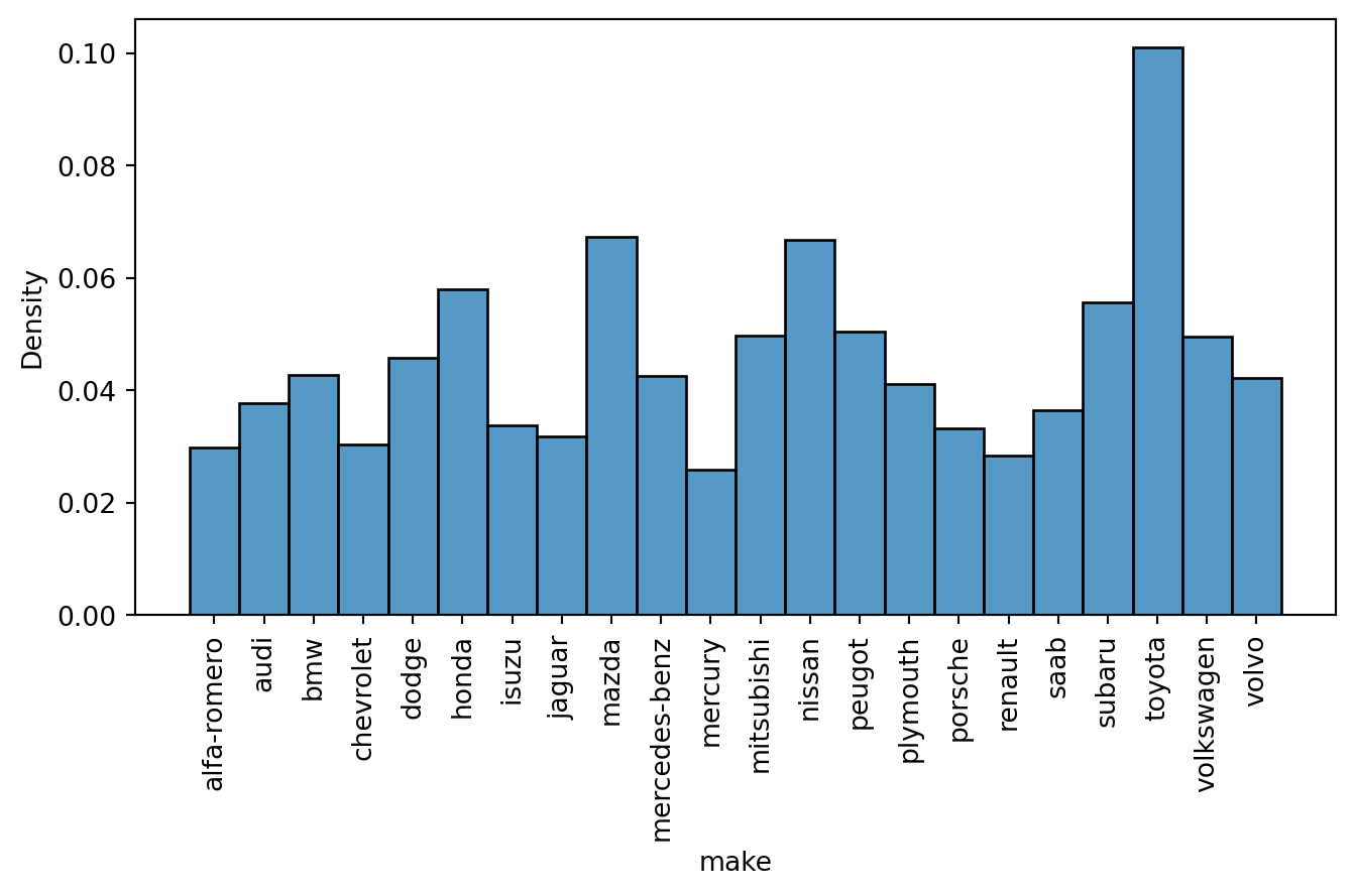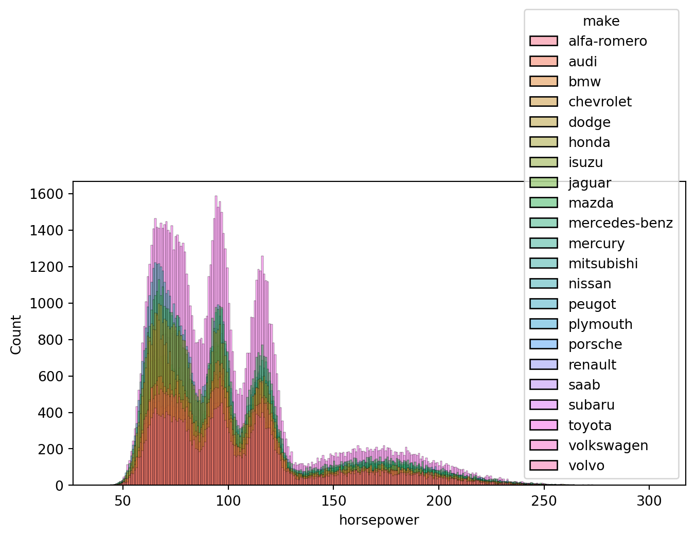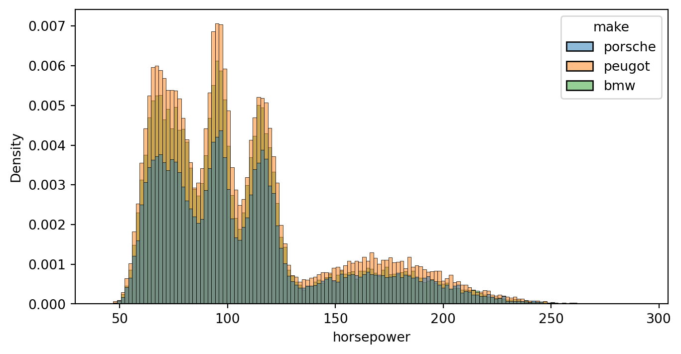 ---title: "Pandas 101"author: "Julien Combes"date: "2025-12-23"categories: [DeepLearning, ENG, code, tuto]image: "memepython.png"---This is a file i send to people so they have some code sample they can copy paste to apply to their own problems. If you need something that is not in this page, or you spot a mistake (likely to have some we never know) let me know and this page will grow as people ask me to update it :).# Getting the dataIn most cases you will already have a file produced by some measurement system. Pandas can read any type of files (csv (separated by comas or semi-colons or any character), excel files and the new but efficient parquet files.)Everything happens with the pandas.read_* methods : ```pythonimport pandas as pdpd.read_csv("files.csv",sep =",", index_col =0...)pd.read_excel("file.xslx")pd.read_parquet("file.parquet")```The sep argument tells pandas what is the characters that splits columns.## Toy dataThings with cars ! it must be good heheheThis first step is only getting the data and is not important. We use [openml](https://docs.openml.org/data/use/) to load data. It is a rich collection of datasets that is very useful to get toy data.```{python}import numpy as npimport pandas as pdimport openmldatasets_list = openml.datasets.list_datasets(output_format="dataframe", status="active", tag="manufacturing")dataset = openml.datasets.get_dataset(248)X, y, is_categorical, feat_names = dataset.get_data( dataset_format="dataframe", target=dataset.default_target_attribute)```# Understanding the data## The tablesPandas provides multiple ways to check our dataset.Here is an not-exhaustive list of atributes we could have wanted to use if we were students learning the tool to master it : - X.shape : number of rows and columns- X.info() : Names, types of columns and number of misisng values - X.describe() : get a statistical summary of each numerical columns like extremums, quantiles ...- X.head(n) : show the n first rows of your datasetBut we are here to be efficient and get information we want in an easy way. I will then show you the only tool you need to get to know your data```{python}from skrub import TableReportTableReport(X)```It produces an interactive view in html of your table that you can explore interactively. You have all you need with dimensions, statistical summaries, classic graphs with distribution of numerical data etc etc.. It all you could have done with only pandas but more. ## The graphsThe available plotting tools are numerous. If you want an idea of what is possible with python here is [a gallery](https://python-graph-gallery.com/) with a lot of nice examples. I will focus with basics but most useful ploting solution.The library we will use is [seaborn](https://seaborn.pydata.org/) that is supposed to work on dataframes. It is based on matplotlib that is the basics plotting brick of python but quite hard to use. Seaborn get things done quickly and nicely.We will see plotting by asking questions : ### What is the proportion of each car maker ? ```{python}import seaborn as snsimport matplotlib.pyplot as pltplt.figure(figsize=(8,4))sns.histplot( X, x ="make", stat ="density")plt.xticks(rotation =90);```# Mutating the dataPandas provides a lot of very usefull methods to filter, modify delete items from a dataframe.::: {.callout-warning}The philosophy in data science is to NEVER modifying by hand the data you are studying.All your processing should be done in one place and clear.:::For example here, we will see the most popular operation you might need in your work.Let's remember what the dataframe looks like : ```{python}X```and see what the prices look like by brand :```{python}plt.figure(figsize=(8,4))sns.boxplot( X, x ="make", y ="price",)plt.xticks(rotation =90);```## Filtering rowsWe have negative prices this looks like errors, lets start with filtering rows.Pandas has a very handy method : query. This method eats a string that contains conditions, in this string you can use columns name as variables and external variables from your code like this.```{python}price_error_threshold =0X.query("price >= @price_error_threshold")```You see that the table only contains 999 875 elements. Some items have been removed. Query is a function that returns a mutated copy of the dataframe. So if you want the dataframe that have been modified, you need to assign it to a new variable like that.```{python}new_df = X.query("price >= @price_error_threshold")new_df```I don't know what is the cleanest way to apply multiple filters, but i would recommend you to apply those in a sequential manner in order to be as clean as possible like that :```{python}( X .query("price > 0") .query("make == 'porsche'") .query("aspiration== 'turbo'") .query("horsepower > 200"))```I wonder how are the horsepowers distributed for each brands : ```{python}plt.figure(figsize=(8,4))sns.histplot( new_df, x ="horsepower", hue ="make")```We can see an interesting pattern in the horsepower distribution ! there are peaks but we have to much brands to see a pattern, lets only compare some of them : ```{python}plt.figure(figsize=(8,4))sns.histplot( ( new_df .query("make.isin(['peugot','porsche','bmw'])") .assign(make =lambda df_: df_.make.astype(object)) ), x ="horsepower", hue ="make", stat ="density",)```Nothing interesting here. Let's see how to mutate columns. You could want to create columns according to a processing of some other columns. ::: {.callout-tip title="Anonymous function"}There is an important part of python that is usually quite useless but we will have to use it here : Anonymous function. It is when you want to use a function wit a unique usage. It is used when a function take another function as argument.:::## Adding columnsIn pandas, we use anonymous functions in various cases let's see examples with the assign method :```{python}( X.assign(volume = X.height * X.width * X.length))```This computation works because the we add the column to X, so X.height is the column of X. But in mos